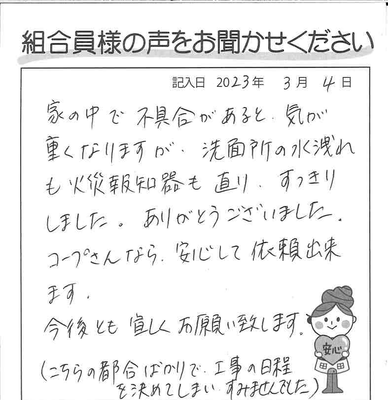コープさんなら安心して依頼出来ます。今後ともよろしくお願い致します。