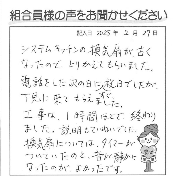 システムキッチンの換気扇が古くなったのでとりかえてもらいました。電話をした次の日にすぐ、祝日でしたが、下見に来てもらえました。 工事は1時間ほどで終わりました。説明もていねいでした。換気扇についてはタイマーがついていたのと、音が静かになったのが良かったです。