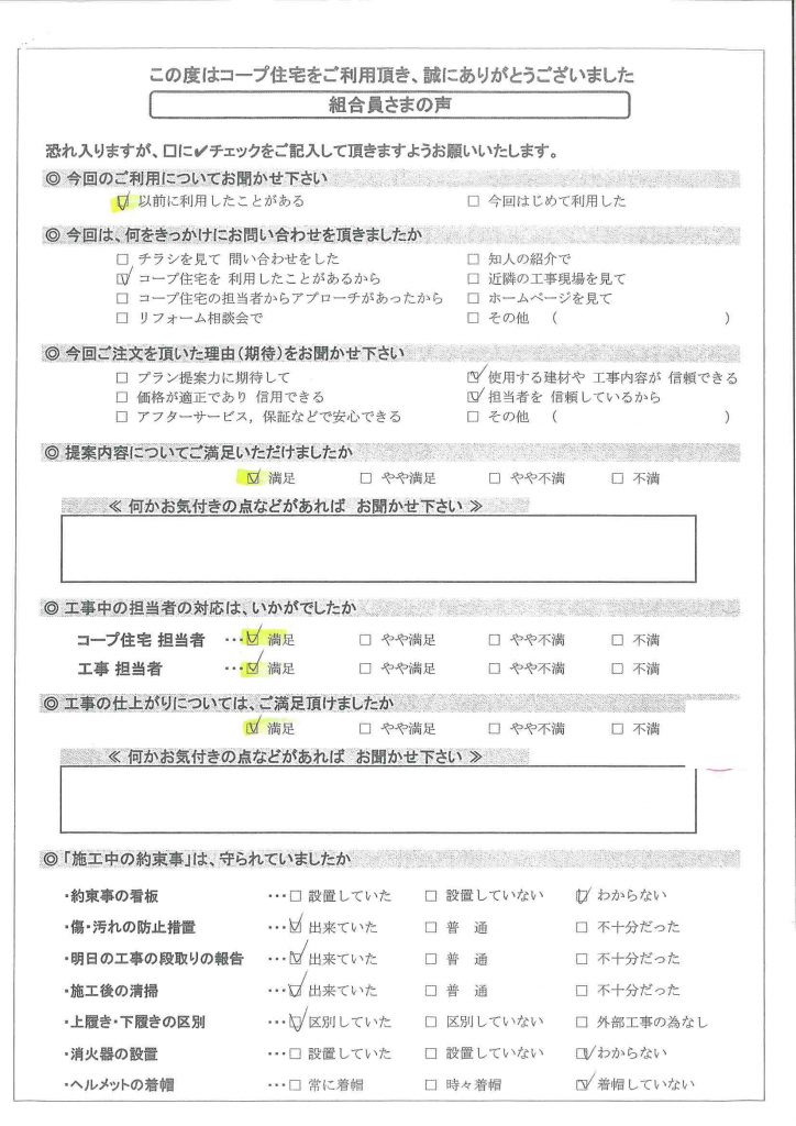 コープ住宅担当者の山下様は、前回も今回もこちらからの疑問には丁寧に答えて頂けましたし、色々なご提案をいただきその中で良い選択が出来ました。また、どの工事担当の方々も仕事の内容だけでなく、対応がとても丁寧でした。早速、友人紹介して頂きましたので、宜しくお願いいたします。