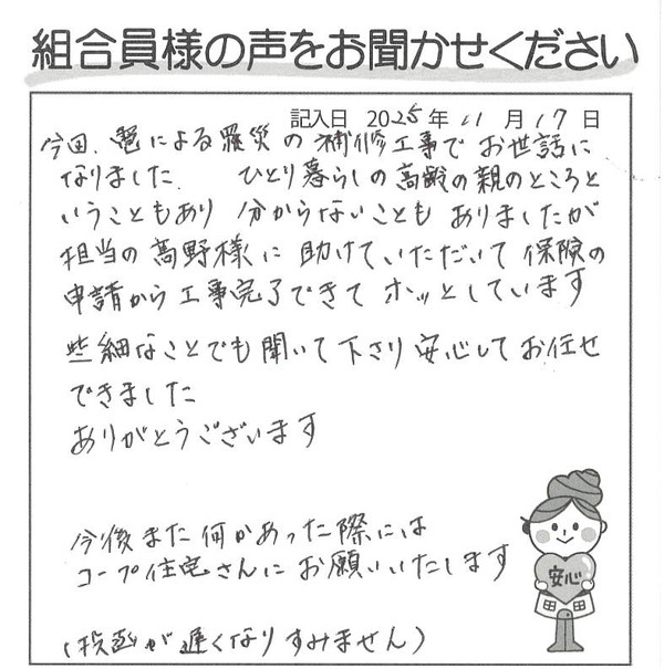 今後また何かあった際にはコープ住宅さんにお願いいたします。