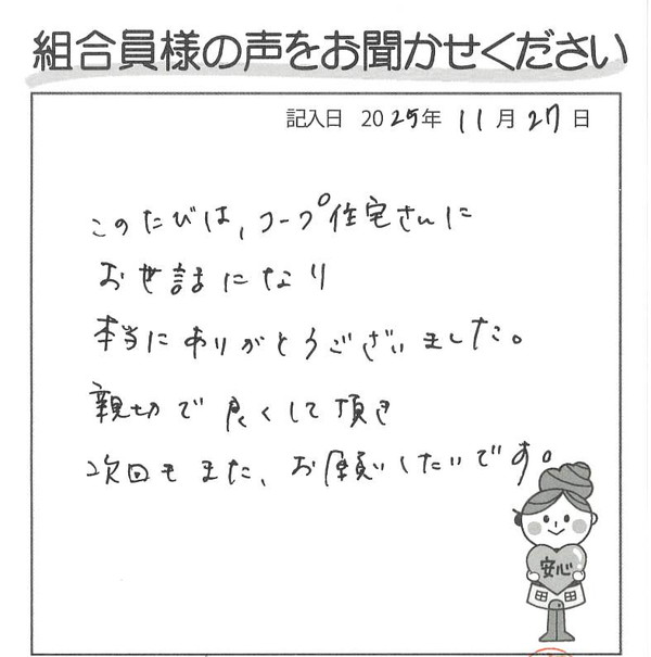 このたびは、コープ住宅さんにお世話になり、本当にありがとうございました。