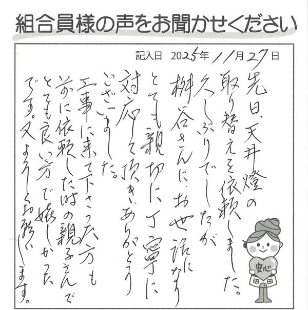 工事に来て下さった方も前に依頼した時の親子さんで、とても良い方で嬉しかったです。又よろしくお願いします。