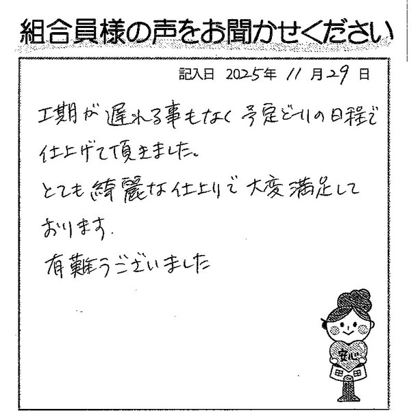 工期が遅れる事もなく、予定どうりの日程で仕上げて頂きました。