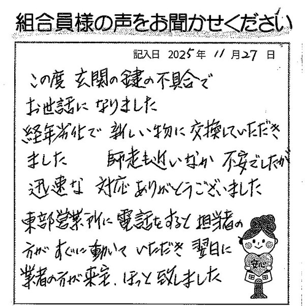 東部営業所に電話すると担当者の方がすぐに動いていただき、翌日には業者の方が来宅、ほっと致しました。