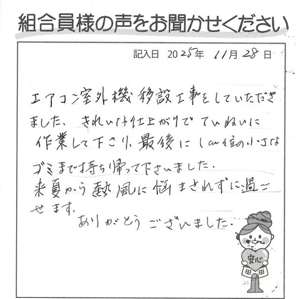 来夏から熱風に悩まされずに過ごせます。ありがとうございました。
