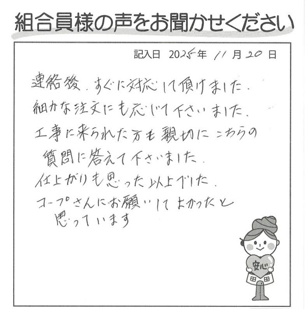 連絡後、すぐに対応して頂けました。 細かな注文にも応じて下さいました。 工事に来られた方も親切にこちらの質問に答えて下さいました。 仕上りも思った以上でした。 コープさんにお願いして良かったと思っています。