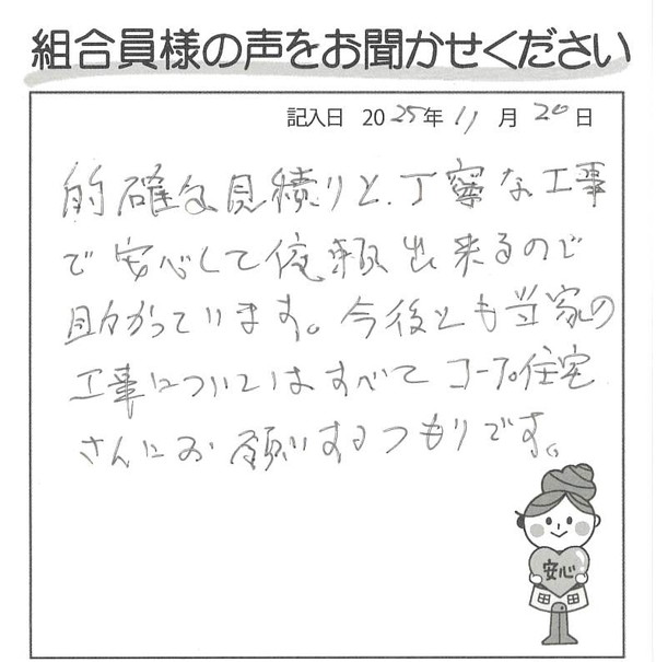 的確な見積りと丁寧な工事で安心して依頼出来るので助かっています。 今後とも当家の工事についてはすべてコープさんにお願いするつもりです。