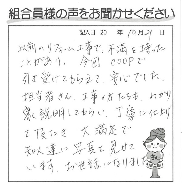以前リフォーム工事で不満を持ったことがあり、今回COOPで引き受けてもらえて安心でした。 担当者さん・工事の方たちも分かりやすく説明してもらい、丁寧に仕上げて頂き大満足で、知人達に写真を見せています。 お世話になりました。