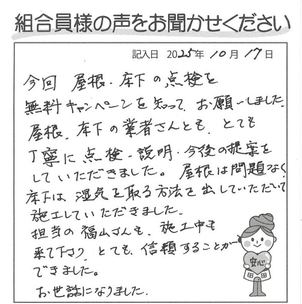 今回、屋根・床下の無料点検を知ってお願いしました。 屋根・床下の業者さんともとても丁寧に点検・説明・今後の提案をしていただきました。屋根は問題なく、床下は湿気を取る方法を出していただいて施工していただきました。 担当の福山さんも、施工中も来て下さり、とても信頼することができました。 お世話になりました。