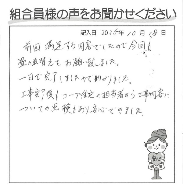 前回満足する内容でしたので、今回も畳の表替えをお願い致しました。 1日で完了しましたので助かりました。工事完了後もコープ住宅の担当者から工事内容についての点検もあり、安心できました。