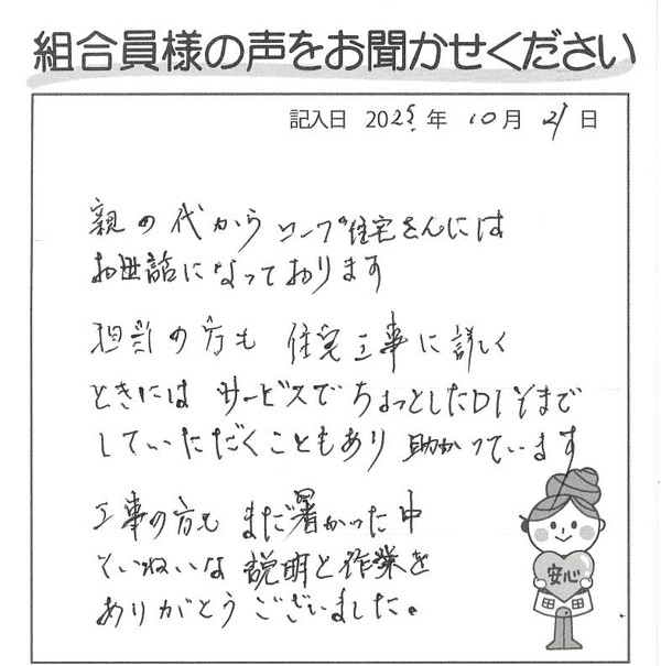 親の代からコープ住宅さんにはお世話になっております。 担当の方も住宅工事に詳しく、ときにはサービスでちょっとしたDIYまでしていただくこともあり、助かっています。 工事の方もまだ暑かった中、ていねいな説明と作業をありがとうございました。