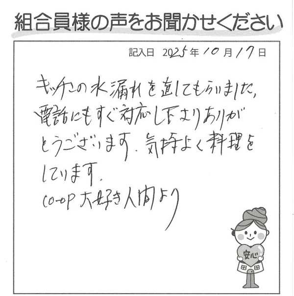キッチンの水漏れを直してもらいました。 電話にもすぐ対応して下さり、ありがとうございます。気持ちよく料理をしています。 CO-OP大好き人間より