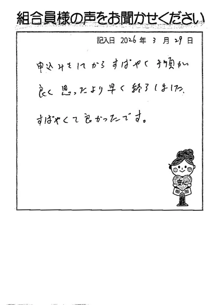 申込みをしてからすばやく手順が良く、思ったより早く終了しました。すばやくて良かったです。