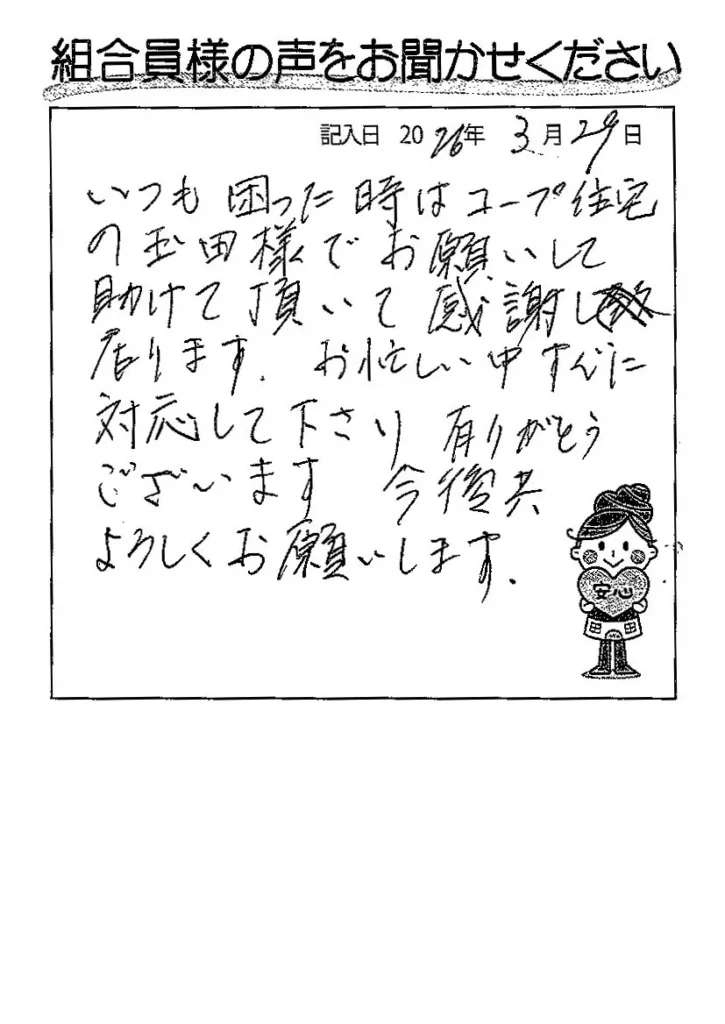 いつも困った時はコープ住宅の玉田様でお願いして助けて頂いて感謝しております。お忙しい中、すぐに対応して下さり、有りがとうございます。今後共、よろしくお願いします。