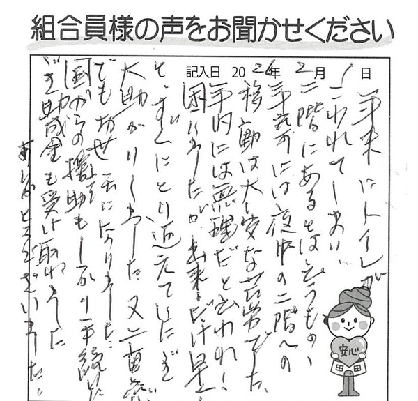 年末にトイレがこわれてしまい、二階にあるとは云うものの、年寄りには夜中の二階への移動は大変な苦労でした。年内には無理だと言われて困りましたが、出来るだけ早くとすぐにとり換えていただき、大助かりしました。又二重窓でもお世話になりました。 国からの援助もしっかり手続きでき、助成金も受け取れました。ありがとうございました。