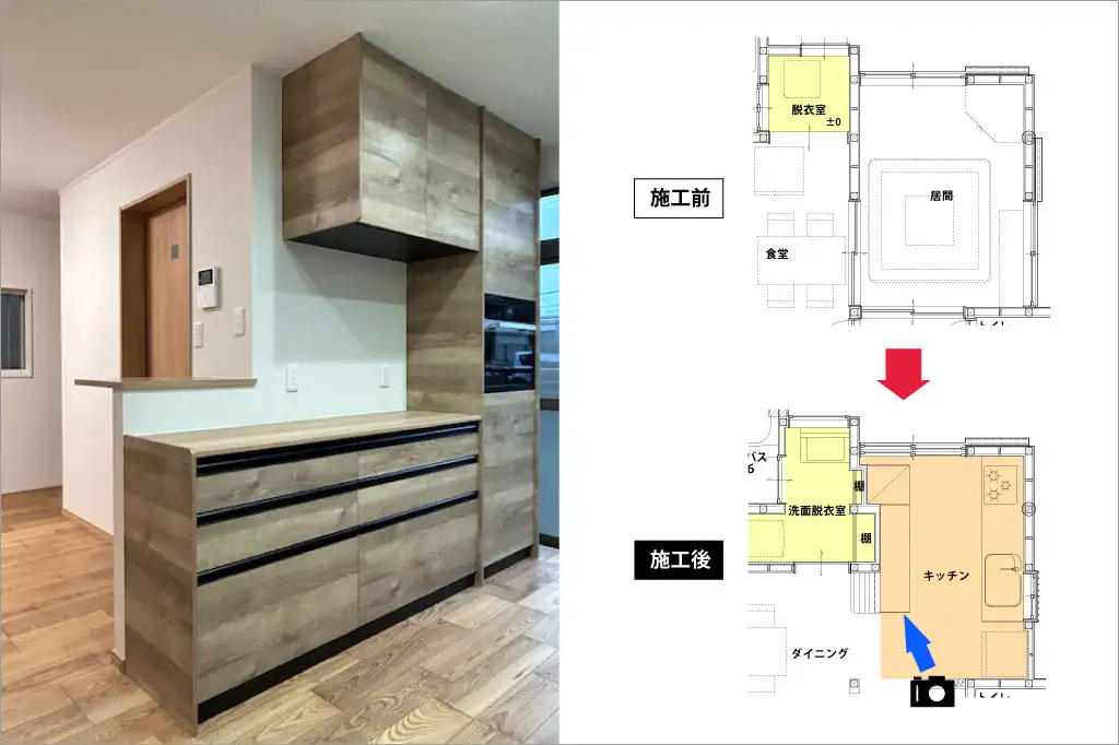 元々居間として使われていた部屋を食堂とつなげ、キッチンに。背面は上で紹介した洗面脱衣所に隣接しており、間仕切り壁をキッチンに合わせて調整しました。洗面所収納とキッチン収納、奥行きの異なる2つの収納スペースが間仕切り壁をはさんで背中合わせに配置されています。