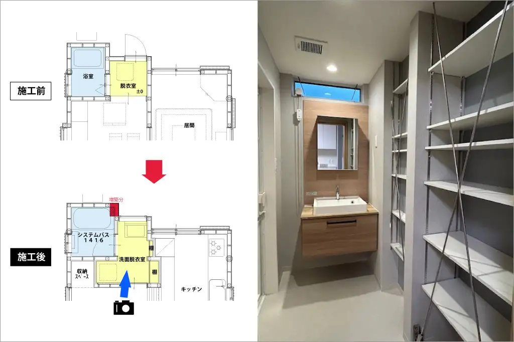 1416サイズのシステムバスが入るように浴室を拡張するだけでなく、隣接する脱衣所の幅も変更することにしました。洗面台向かって右手の壁面が耐力壁だったため、ステンレスブレースを設置して、壁位置に耐力性能を残しながらも、間口を開放して可動棚とすることができました。