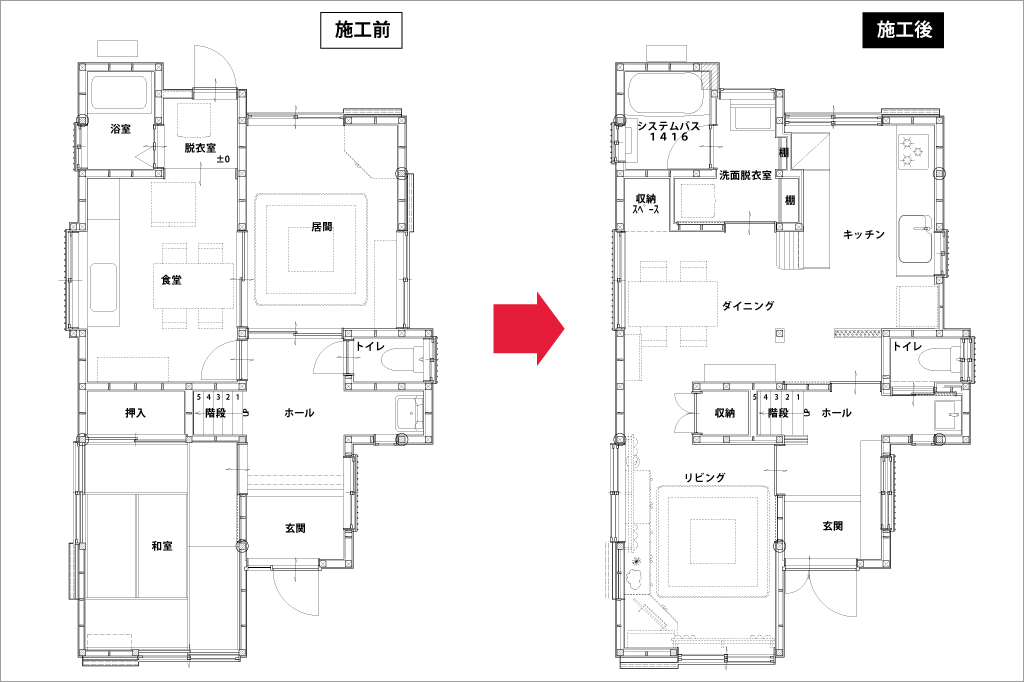 また施工前は食堂・和室・居間と別れていた3室を、ダイニング・リビング・キッチンへリフォームして繋げ、耐震性と断熱性を大幅に向上させることができました。