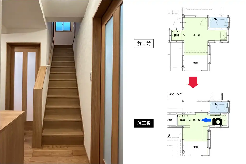 4号縮小での階段架け替えの高額化を見据え、階段もゆったりと架け替えました。ダイニングとの間の建具を移動させたこともあり、玄関ホールは施工前よりも実際には狭くなっているが、元の閉塞感は感じられません。