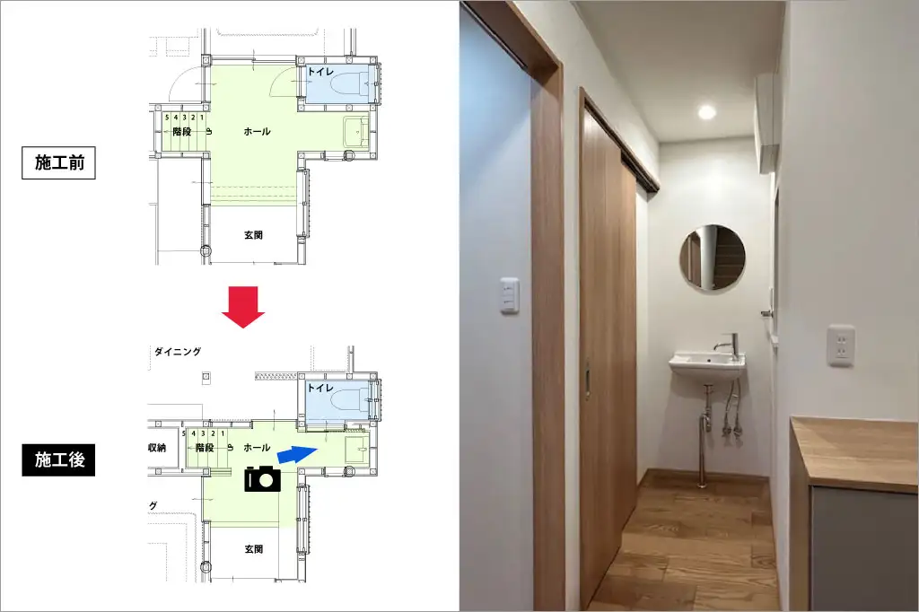 元々洗面所だった場所は、トイレ用の手洗いスペース兼玄関横の手洗いスペースとしました。トイレの扉も正面から側面へ変更し、引き戸に変更しています。
