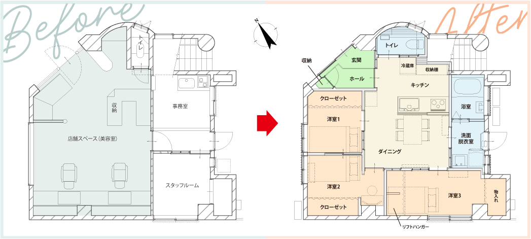 自宅1階で理髪店を営まれていましたが、引退に伴い住居に改装したいとご要望をいただきました。元々住居スペースとされていた2階・3階は息子様ご家族が入居するとのことでした。