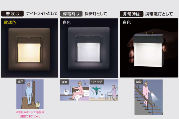 通常は人感センサー付きフットライトとして使用可能。停電時には自動で保安灯に切り替わり、取り外せば非常用の携帯ライトとしても活躍します。普段からの防犯・安全対策だけでなく、防災アイテムを兼ねられるライトです。