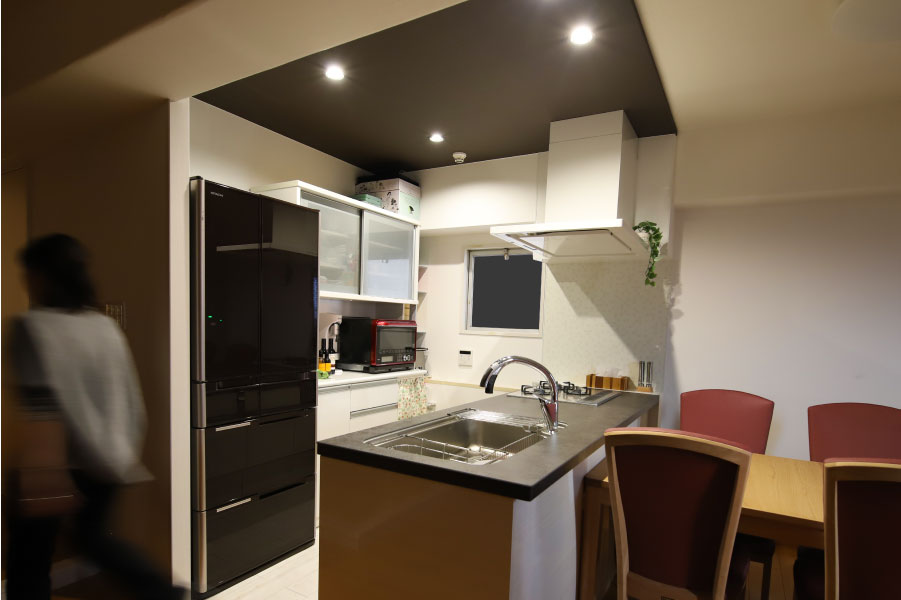 最近はダウンライトの種類も豊富。枠が黒いタイプもあり、天井がダークカラーのクロスでも器具が目立ちにくい設計です。
