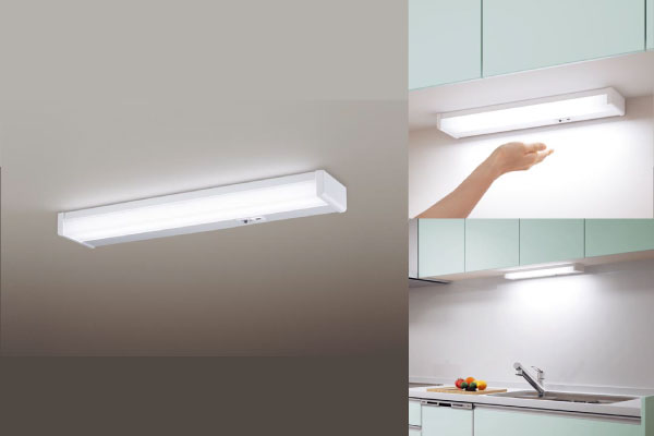 あかりに手を近づけるだけで点灯・消灯ができるキッチン灯。濡れた手でもさわらずにスイッチの操作ができるので、感電の心配がなく、しかも衛生的です。