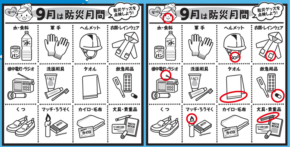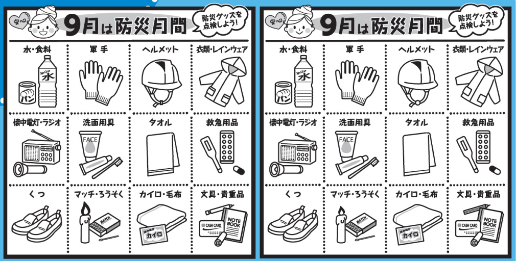 9月は防災月間です。今回の間違い探しは、 防災グッズのチェックリストとしても使えます🎵