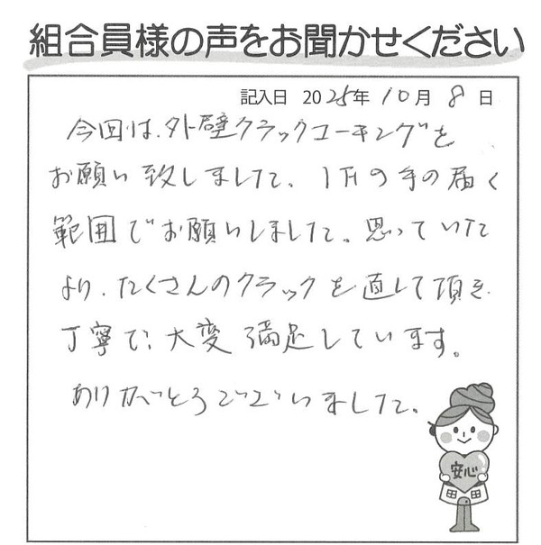 1階の手の届く範囲でお願いしました。思っていたより、たくさんのクラックを直して頂き、丁寧で大変満足しています。ありがとうございました。