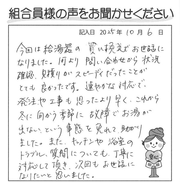 何より問い合わせから状況確認、見積りがスピーディだったことがとても良かったです。速やかな対応で、発注や工事も思ったより早く、これから冬に向かう季節に故障でお湯が出ないという事態を免れて、助かりました。またキッチンや浴室のトラブル、質問についても丁寧に対応して頂き、次回もお世話になりたいと思いました。