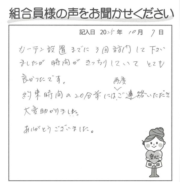 カーテン設置までに3階訪問してくださいましたが、時間がきっちりしていてとても良かったです。