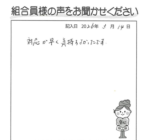 ・丁寧でアフターサービスも良く、声をかけてくれる。 ・小さい事まで行き届いた対応で、組合員の困り事に親切に相談に乗ってくれ、無理なく信頼出来る。