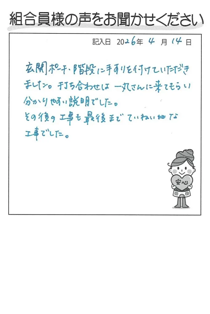 玄関ポーチ・階段に手すりを付けていただきました。打合せは一丸さんに来てもらい分かりやすい説明でした。その後の工事も最後までていねいな工事でした。