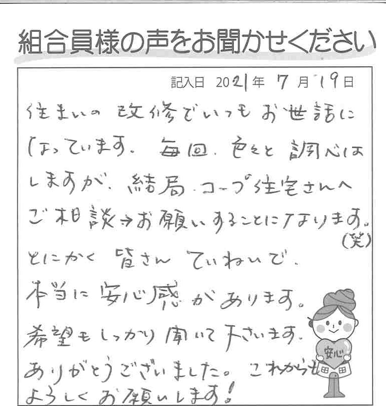 住まいの改修でいつもお世話になっています。毎回、色々と調べはしますが、結局コープ住宅さんへご相談→お願いすることになります。(笑) とにかく皆さんていねいで本当に安心感があります。希望もしっかり聞いて下さいます。ありがとうございました。これからもよろしくお願いします!