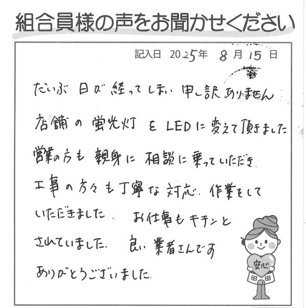だいぶ日が経ってしまい、申し訳ありません。 店舗の蛍光灯をLEDに変えて頂きました。営業の方も親身に相談に乗っていただき、工事の方々も丁寧な対応・作業をしていただきました。お仕事もキチンとされていました。良い業者さんです。 ありがとうございました。