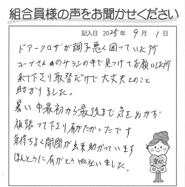ドアクローザが調子悪く困っていたところ、コープさんのチラシの中で見つけてお願いした所来て下さり、取替だけで大丈夫とのこと、助かりました。 暑い中、最初から最後まで気をぬかず頑張って下さり、有りがたかったです。気持ちよく開閉が出来、助かっています。 ほんとうに有りがとう御座いました。
