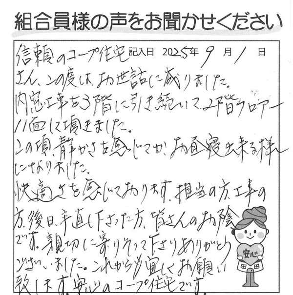 快適さを感じております。担当の方、工事の方、後日手直しをして下さった方、皆さんのお蔭です。親切に寄り添って下さり、ありがとうございました。これからも宜しくお願い致します。安心のコープ住宅です。