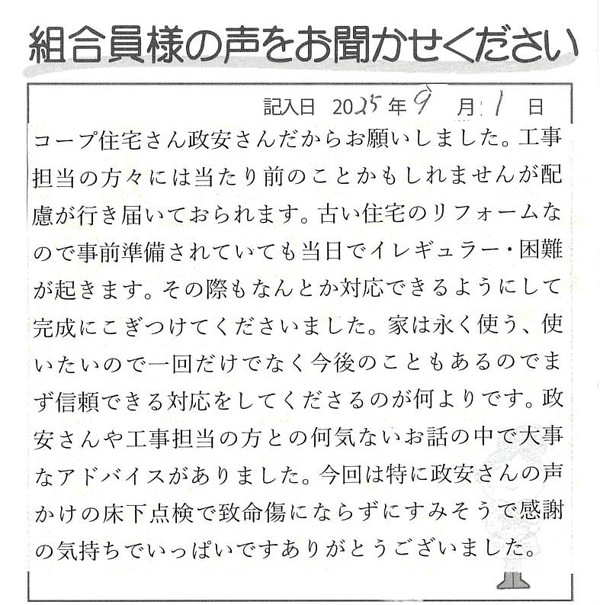 コープ住宅さん政安さんだからお願いしました。工事担当の方々には当たり前のことかもしれませんが配慮が行き届いておられます。古い住宅のリフォームなので事前準備されていても当日でイレギュラー・困難が起きます。その際もなんとか対応できるようにして完成にこぎつけてくださいました。家は永く使う、使いたいので一回だけでなく今後のこともあるのでまず信頼できる対応をしてくださるのが何よりです。政安さんや工事担当の方との何気ないお話の中で大事なアドバイスがありました。今回は特に政安さんの声かけの床下点検で致命傷にならずにすみそうで感謝の気持ちでいっぱいです。ありがとうございました。