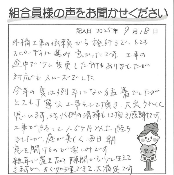 今年の夏は例年にない猛暑でしたが、とても丁寧な工事をして頂き、大変うれしく思います。汚水桝の清掃もして頂き感謝です。工事が終わって1.5カ月以上経ちましたが、庭が美しく、毎日朝窓を開けるのが楽しみです。