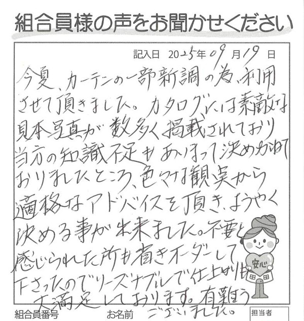 今夏、カーテンの一部新調の為、利用させて頂きました。カタログには素敵な見本写真が数多く掲載されており、当方の知識不足もあいまって決めかねておりましたところ、色々な観点から的確なアドバイスを頂き、ようやく決める事が出来ました。不要と感じられた所も省き、オーダーして下さったのでリーズナブルで仕上がりも大満足しております。有難うございました。