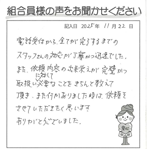 お寄せいただいた工事後のアンケートの中から一部のご感想をご紹介いたします。