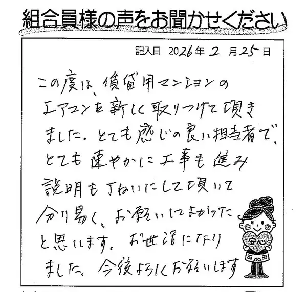 この度は、賃貸用マンションのエアコンを新しく取りつけて頂きました。とても感じの良い担当者で、とても速やかに工事も進み、説明も丁寧にして頂いて分かり易く、お願いしてよかったと思います。お世話になりました。今後よろしくお願いします。