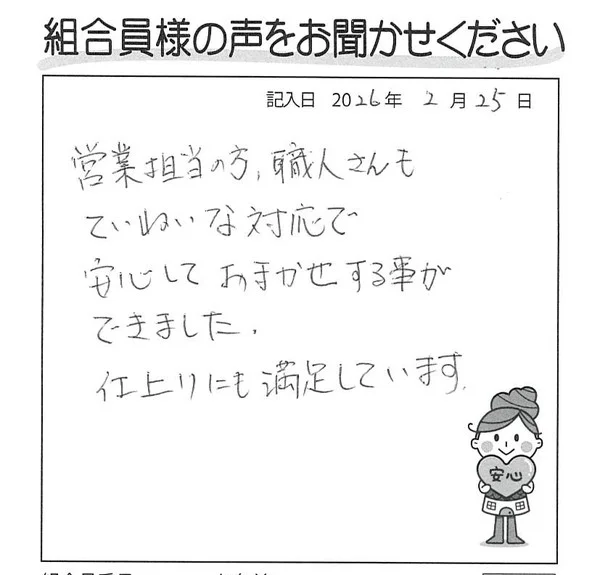 営業担当の方、職人さんもていねいな対応で安心しておまかせする事ができました。 仕上りにも満足しています。