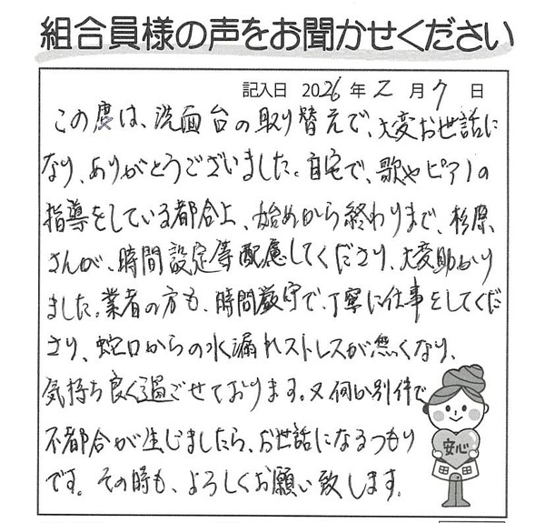 この度は洗面台の取り替えで大変お世話になり、ありがとうございました。自宅で歌やピアノの指導をしている都合上、始めから終わりまで杉原さんが時間設定等配慮してくださり、大変助かりました。業者の方も、時間厳守で丁寧に仕事をしてくださり、蛇口からの水漏れストレスが無くなり、気持ち良く過ごせております。又何か別件で不都合が生じましたら、お世話になるつもりです。その時もよろしくお願い致します。