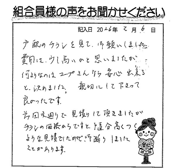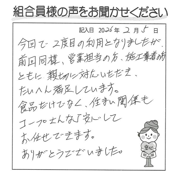 今回で2度目の利用となりましたが、前回同様、営業の方、施工業者の方も共に親切に対応いただき、たいへん満足しています。 食品だけでなく住まい関係もコープさんなら安心してお任せできます。ありがとうございました。