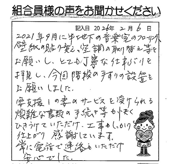 2021年9月に半地下の音楽室のフローリング、壁紙の貼り替え、空調の取り替え等をお願いし、とても丁寧な仕事ぶりを拝見し、今回階段の手すりの設置をお願いしました。 要介護1の妻のサービスを受けられる煩雑な書類の手続き等も快くひきうけていただけ、工事もしっかり仕上り感謝しています。 常に電話で連絡もいただけ、安心でした。