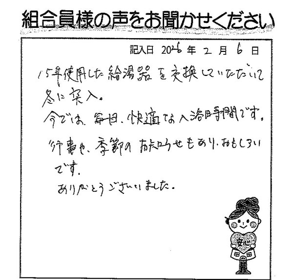 15年使用した給湯器を交換していただいて冬に突入。今では毎日、快適な入浴時間です。 リモコンから行事や季節のお知らせもあり(ノーリツ 給湯器GT-C72シリーズ)、おもしろいです。 ありがとうございました。