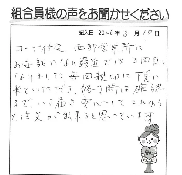 コープ住宅西部営業所にお世話になり、最近では3回目になりました。毎回親切に下見に来ていただき、終了時は確認まで行き届き、安心してこれからも注文が出来ると思っています。