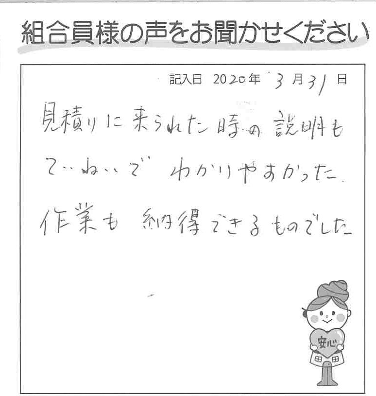 見積りに来られた時の説明もていねいでわかりやすかった。作業も納得できるものでした。